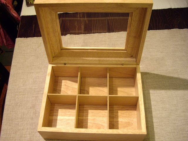 Drewniane pudełko z szybką na herbatę - od dawna takiego szukałam, bo wciąż mam bałagan w biżuterii, a teraz chociaż porządek będzie. Mam pudła z IKEI, ale są plastikowe i mi się aż tak bardzo nie podobają. Poza tym trzymam tam inne przydasie hafciarsko-różne oraz guziki. Biżuteria mi jakoś tam nie pasowała. Także ucieszyłam się, zwłaszcza, że cena na do widzenia - nie wiem dlaczego wcześniej go nie widziałam, ale za często tam nie bywam więc musiałam to jakoś przeoczyć.